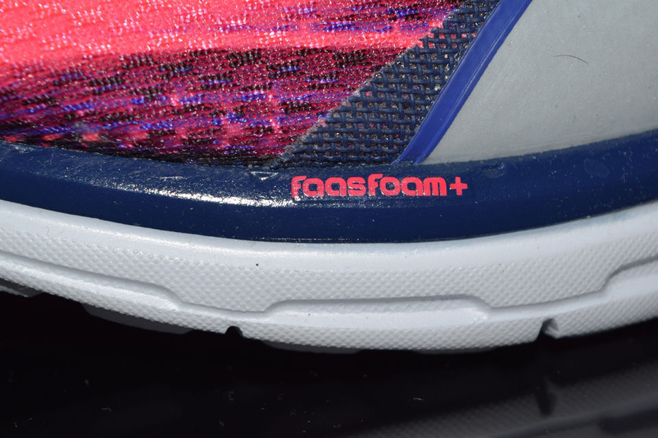FAAS系列里以轻量型设计较为成功的就是FAAS 300系列,它即可以应用于日常训练又可以直接用来参加正式的比赛,属于轻量型跑鞋的上乘之作。这一代的FAAS 300v4重量为220克(中国码42.5),应该说这个系列一直以来重量都是变化不大的,这也与它的大底设计风格紧密相关,从早期的1代到如今的4代大底结构始终没变,这也是我们比较喜欢300这个系列的原因之一。耐磨部分依然是多年采用的EverTrack,后期版本在前掌加强了灵活性,完全考虑到了蹬地发力时的变化,在鞋面部分加设的反光条设计算是这一代最大的变化之一,同时鞋跟部位也同样有反光设置,中底采用的FAASFoam+比以前减轻了25%,而8MM落差依旧被标注在鞋身上。